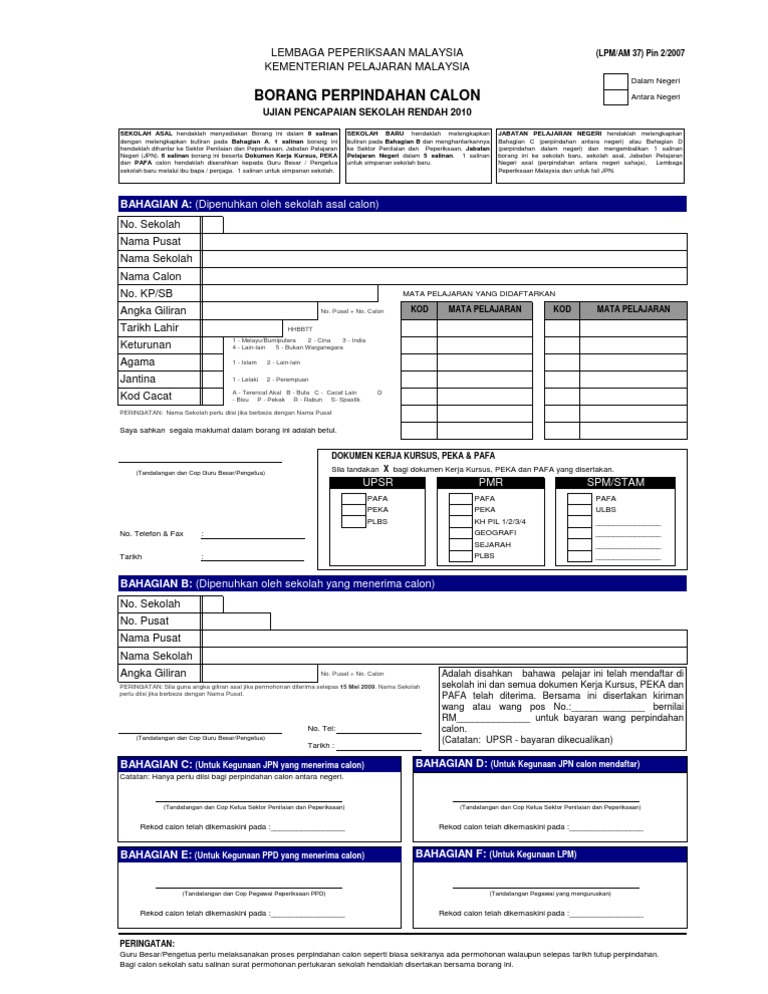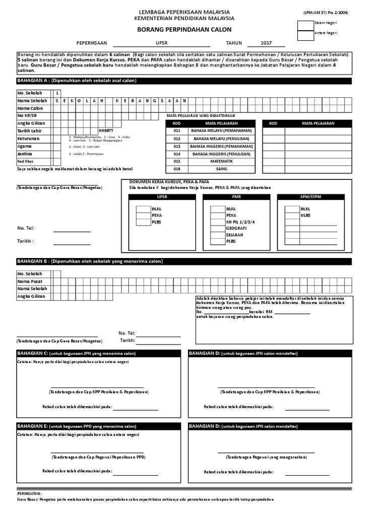 Borang Pindah Calon Upsr : Calon hendaklah membaca garis panduan dan arahan peperiksaan yang dinyatakan dalam jadual waktu peperiksaan upsr 2020 dan.. Panduan dan borang pendaftaran calon persendirian spmu & spm 2020 online. Calon hendaklah membaca garis panduan dan arahan peperiksaan yang dinyatakan dalam jadual waktu peperiksaan upsr 2020 dan. Makluman kepada calon ujian pencapaian sekolah rendah (upsr) semakan keputusan boleh dibuat melalui aplikasi talian online atau melalui sistem slip penuh upsr boleh diperolehi di sekolah pada tarikh keputusan diumumkan pada jam 10:00 pagi. Borang pendaftaran calon upsr 2. Dengan adanya borang tersebut ia dapat memudahkam calon untuk menyiapkan tugasan kerja kursus lebih kompleks.