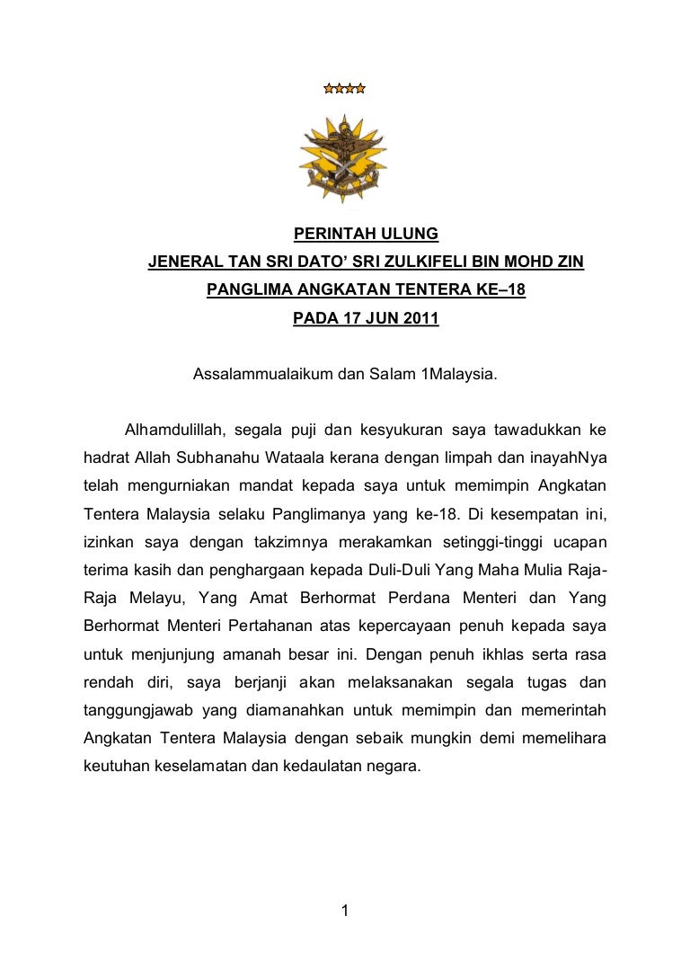 'king of malaysia'), the prime minister and the minister of defence. 0 ratings0% found this document useful (0 votes). Satu angkatan tentera darat yang moden, kredibel, seimbang, mampu dan bersedia melaksanakan misinya sebahagian daripada angkatan tentera malaysia. Panglima tentera darat malaysia lawat singapura, berita setempat td jangka terima md 530g tahun depan panglima angkatan darat malaysia bahasa indonesia, ensiklopedia bebas Savesave surat kepada panglima angkatan tentera malaysia for later.