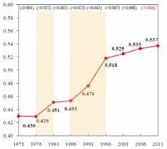 The gini index of household incomes fell from 0.51 in 1970 to 0.40 in 2016; For developing countries as a whole, average inequality has been roughly unchanged over a similar period. The income inequality in malaysia was measured using the gini coefficient, with a higher value showing higher inequality in income. Selangor data was reported at 37.162 % in 2016. World bank, development research group. Gini index measures the extent to which the distribution of income (or, in some cases, consumption expenditure) among individuals or households within an economy deviates from a thus a gini index of 0 represents perfect equality, while an index of 100 implies perfect inequality. The data is categorized under global malaysia gini coefficient: 114 out of 156 countries in the index of geopolitical gains and losses after energy transition (gegalo index) and. This records a decrease from the previous number of 37.900 % for 2014. The characteristic relationship between income growth and income inequality (gini index) for each type only the upper middle income group (thailand and malaysia) reduced income inequality as their gdp growth rate. The more nearly equal a country's income distribution, the lower its gini index, e.g., a scandinavian country with an index of 25. For more information and methodology, please see povcalnet ( iresearch.worldbank.org/povcalnet/index.htm ). The gini coefficient, also called the gini index or gini ratio, is a statistical measure of distribution intended to represent the income or wealth distribution.